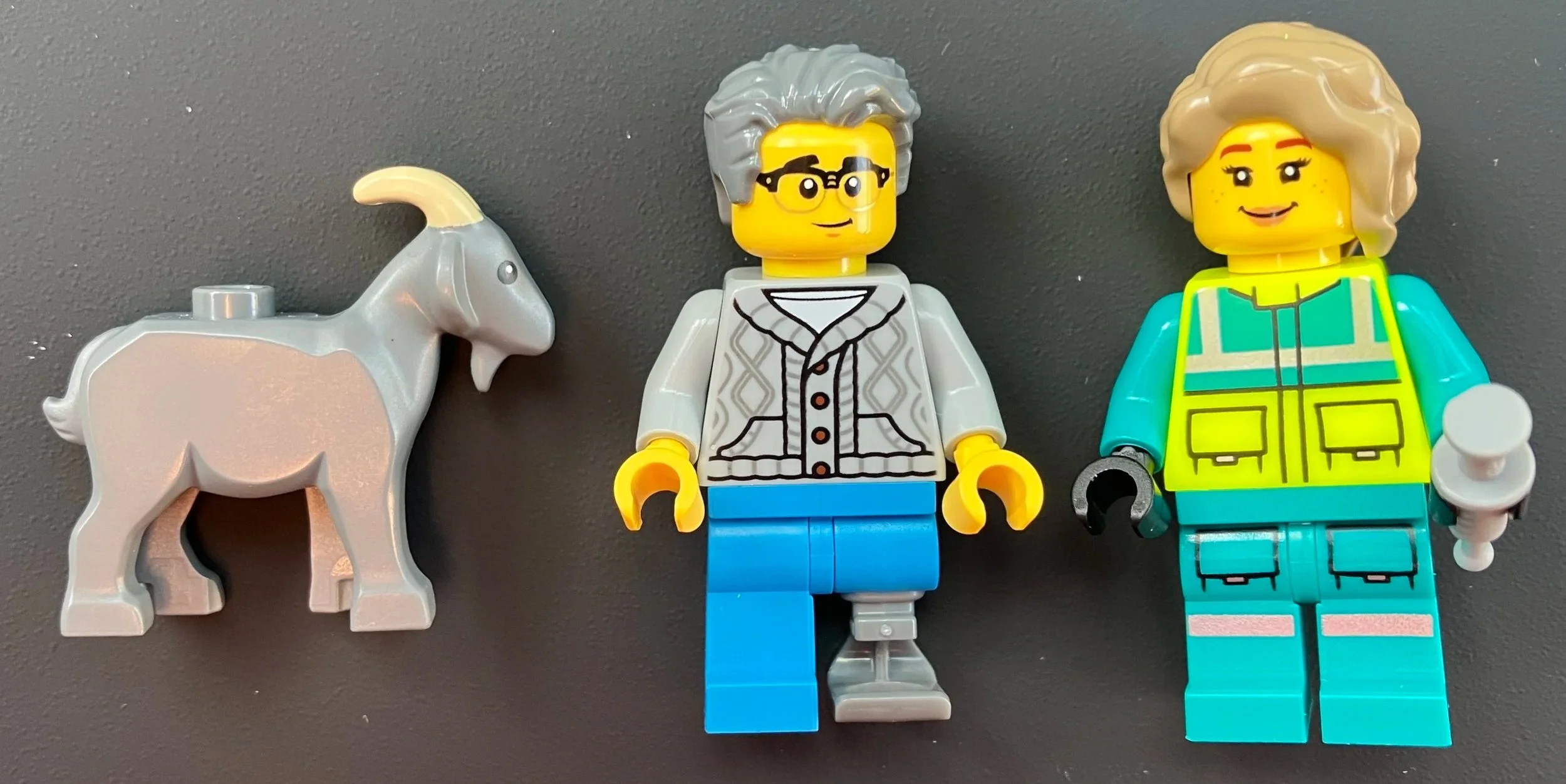 Next up are the minifigures. First is the goat which was from #10332-1: Medieval Town Square. Then there’s a male minifigure with a prosthetic leg and a female minifigure with a shot. Apparently she’s going to shoot up the goat? Or maybe the dude? Not sure. Either way, it’s cool to get minifigures in the swag bag.