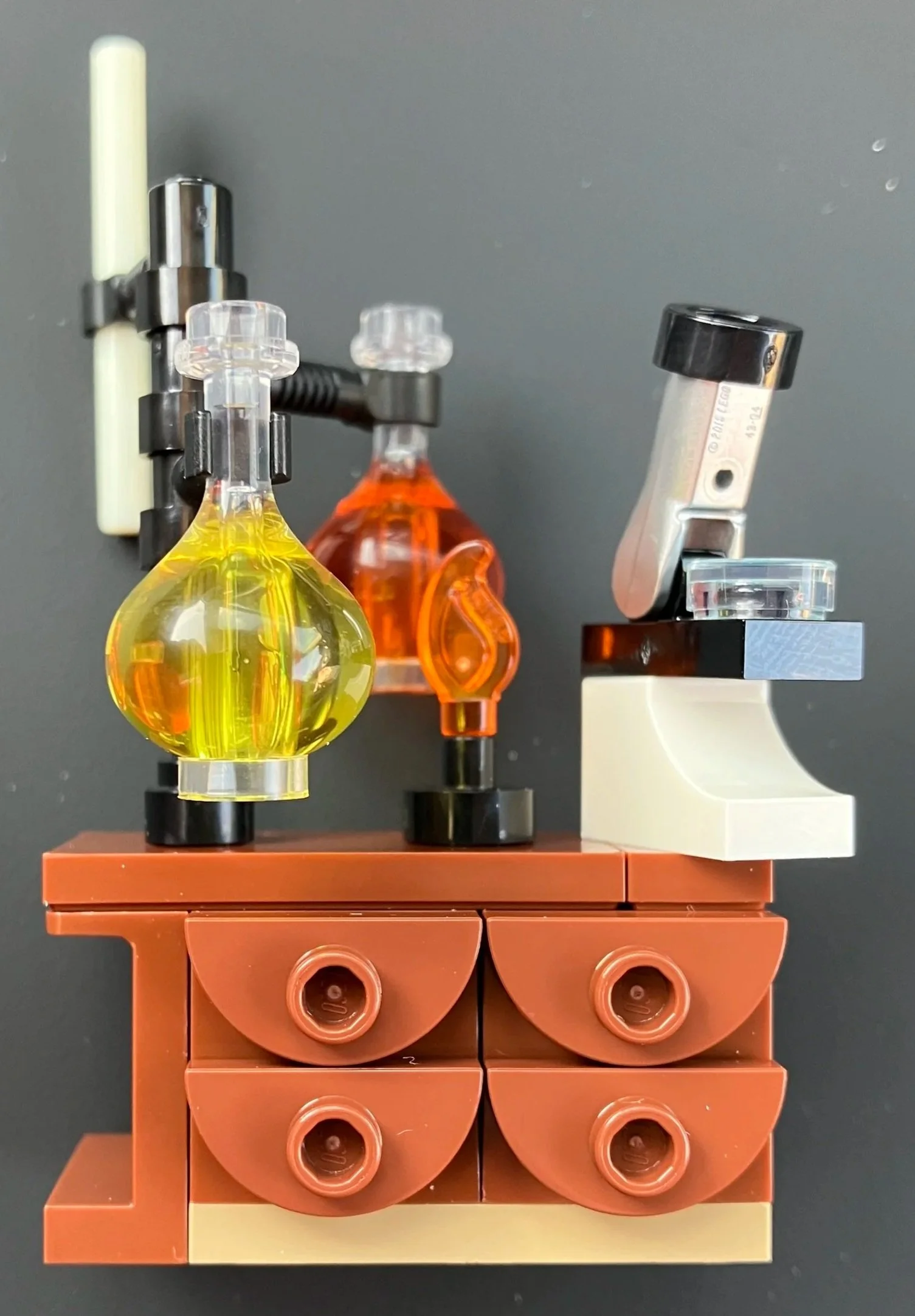 The first part of the build is a lab table with a chemistry experiment and a microscope. The has some drawers built in which is cool. There is a printed sand green tile with the theme logo which is cool to have an exclusive element like this.