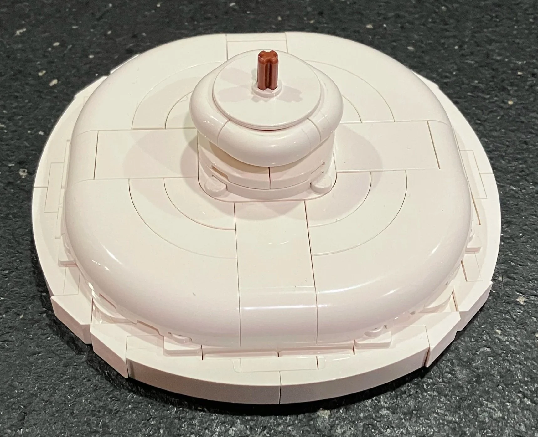The fourth bag adds the lamp, a base (to attach the flattened ball to), and finishes the arm of the lamp. The lamp itself includes the lamp cover and the bulb. Inside the bulb piece is a mini build from another Pixar movie (no spoilers here). The base piece is a small square with a place to hold the ball when you remove two of the round pieces to make it look like Luxo Jr. is jumping on top of the ball. Then the arm is finished with two rubber bands that connect some pin pieces and are covered by a rubber piece that looks like it could be metal or maybe a spring.