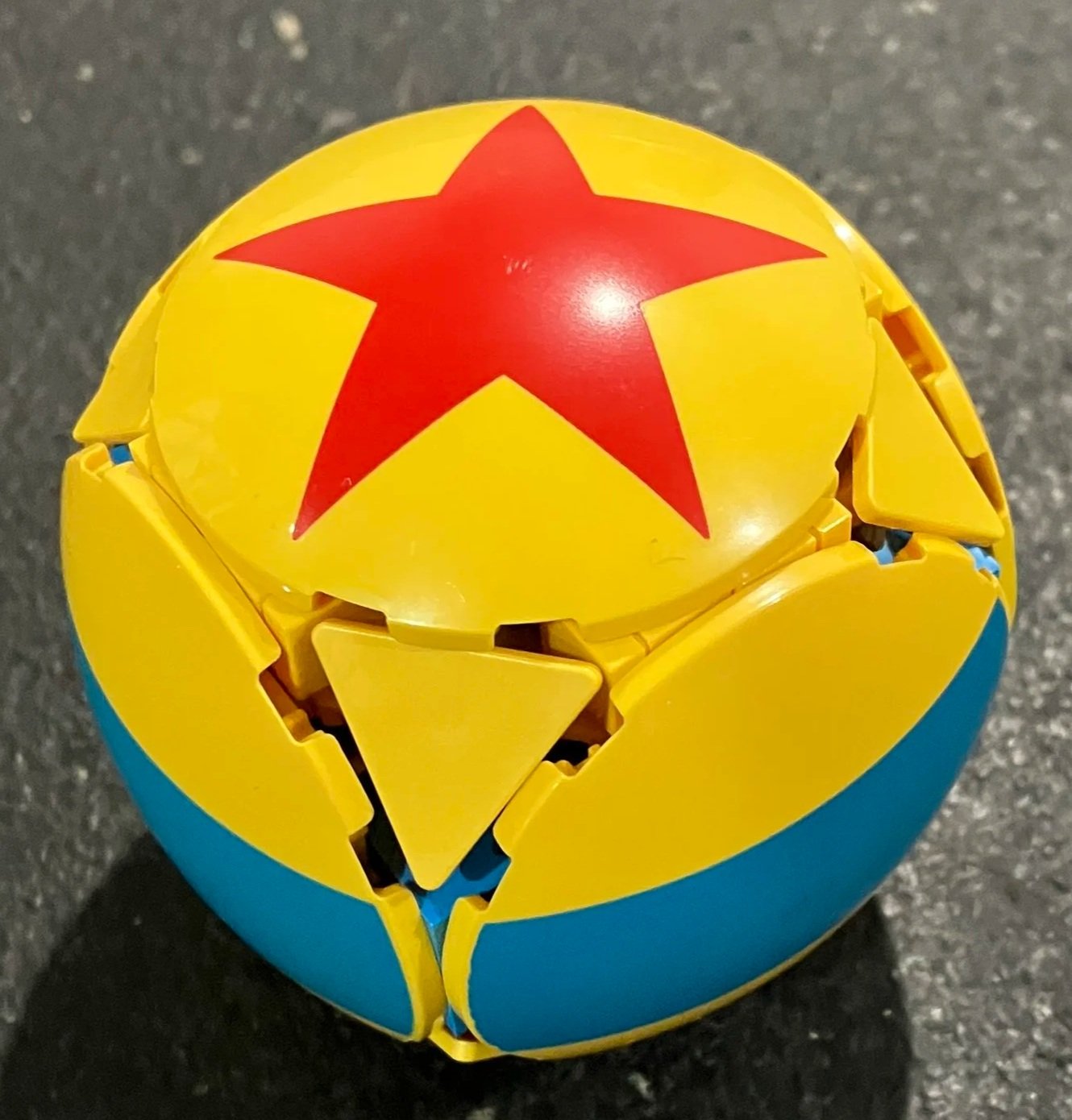 The first bag assembles Luxo Jr’s ball. The inside is a cube with SNOT bricks. There are a number of colored pieces assembled together to resemble characters in various Pixar movies. Then there are a number of printed round pieces to make the ball round and are printed with the stripe and stars. In-between those round pieces are some triangle pieces to fill in the spaces.