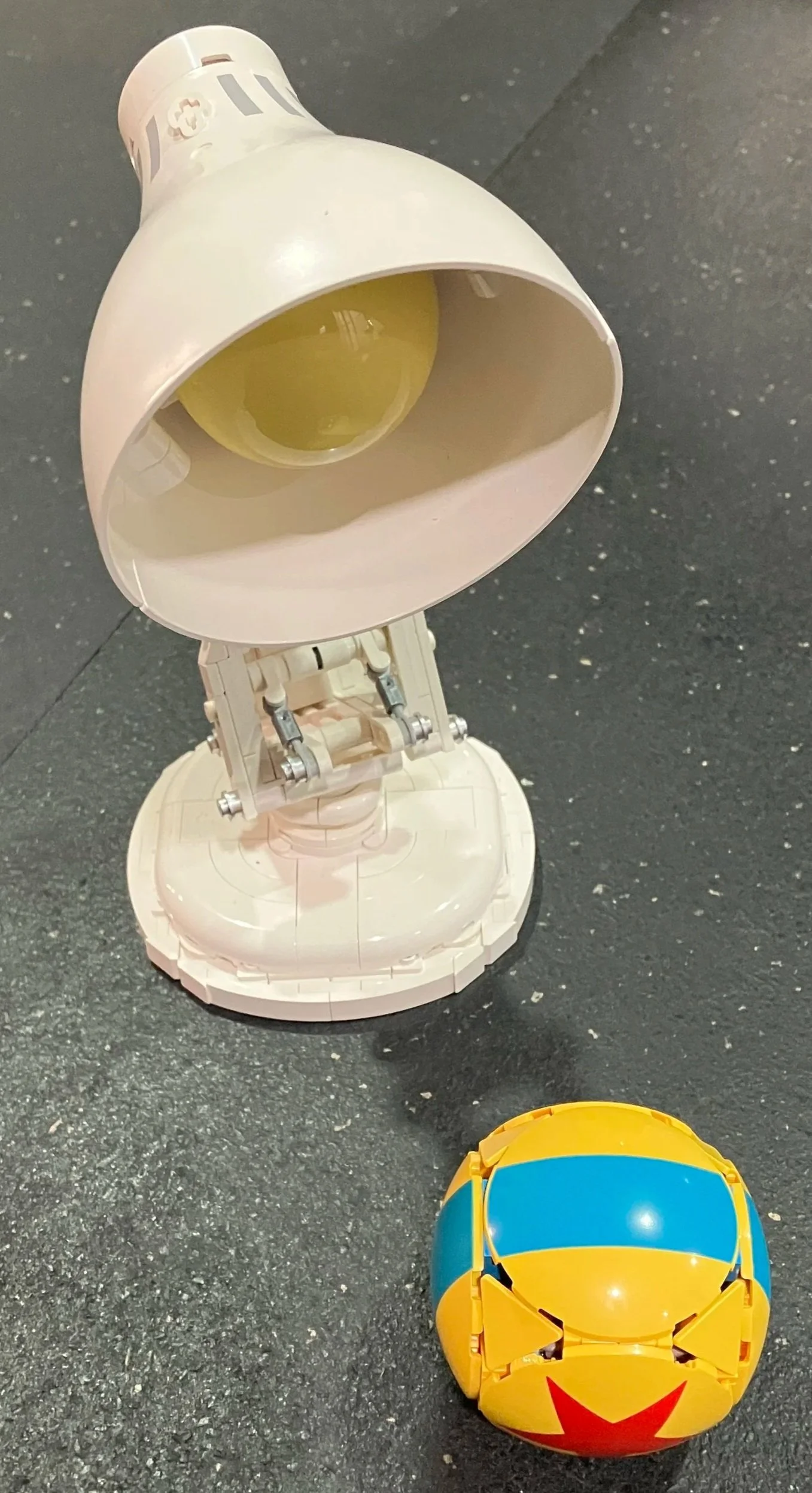 Here are some final pictures of Luxo Jr. and the ball. The build was great with some interesting piece usage to create a very realistic looking lamp. The cost is a bit steep so look for a sale like I did. I don’t believe it’s retiring soon so you have some time to wait for a good sale. The lamp has numerous poseable functions and can be adjusted without falling over or rotating with gravity. Great job design team!