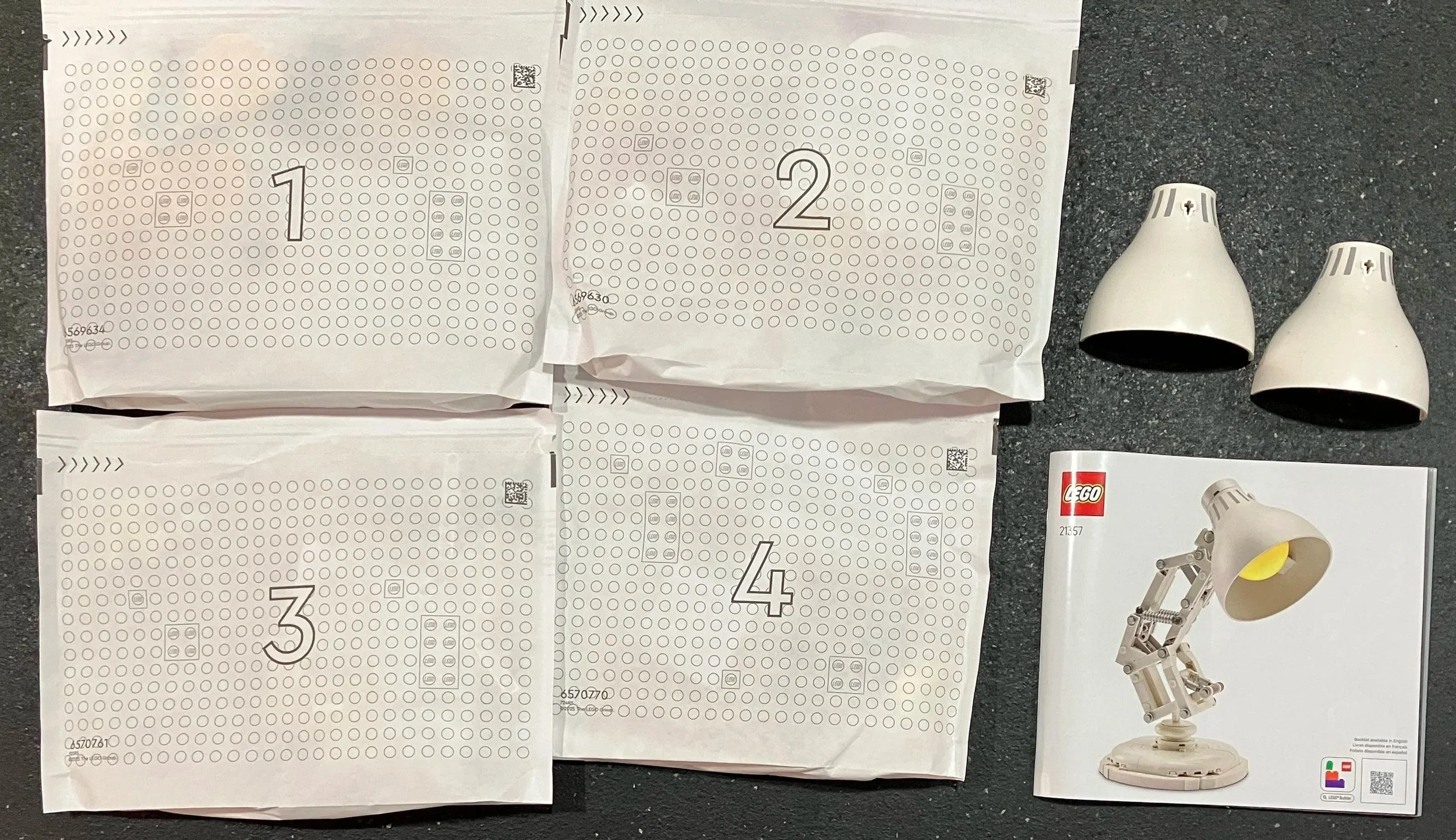 The box contains four numbered parts bags, an instruction booklet, and the two lamp shade pieces. This is my first set with the recyclable paper bags. It was so great to be able to recycle the bags when I was done instead of throwing the plastic bags into the trash. Thank you LEGO!!!