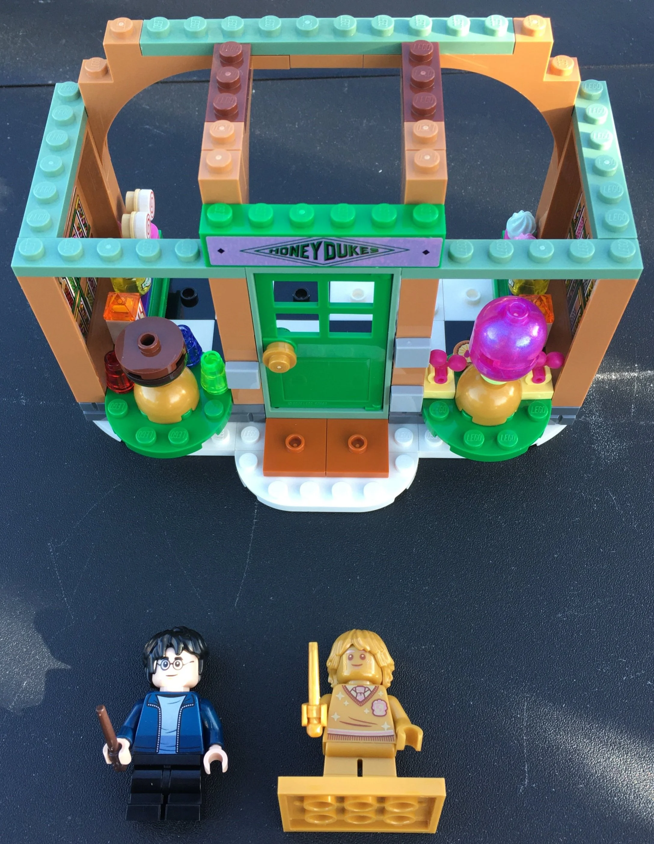 Bag one starts Honey Dukes. I don’t actually recall seeing this store in any of the movies so I will have to go back at some point and pay close attention to spot it. While the façade has a dreary brown shade, inside is very bright with lots of colors and parts that make up the various sugary items for sale. It definitely helps to liven up the traditional, brown/tan Harry Potter builds.