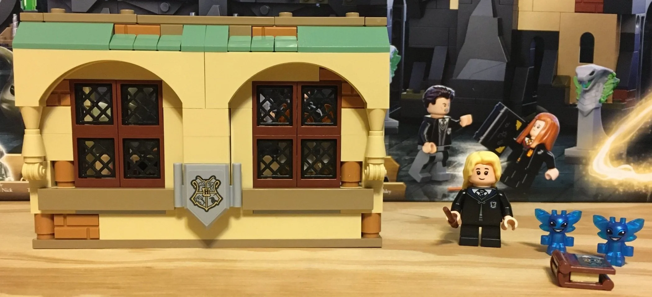 The second build is a section of building which appears to be part of Professor Gilderoy’s classroom based on the sticker you attach. There are two desks and a small table. The table has a minifigure printed skull on it. There’s also a candelabra. The outside seems to fit the architectural style of Hogwart’s and there’s a shield with the school crest.