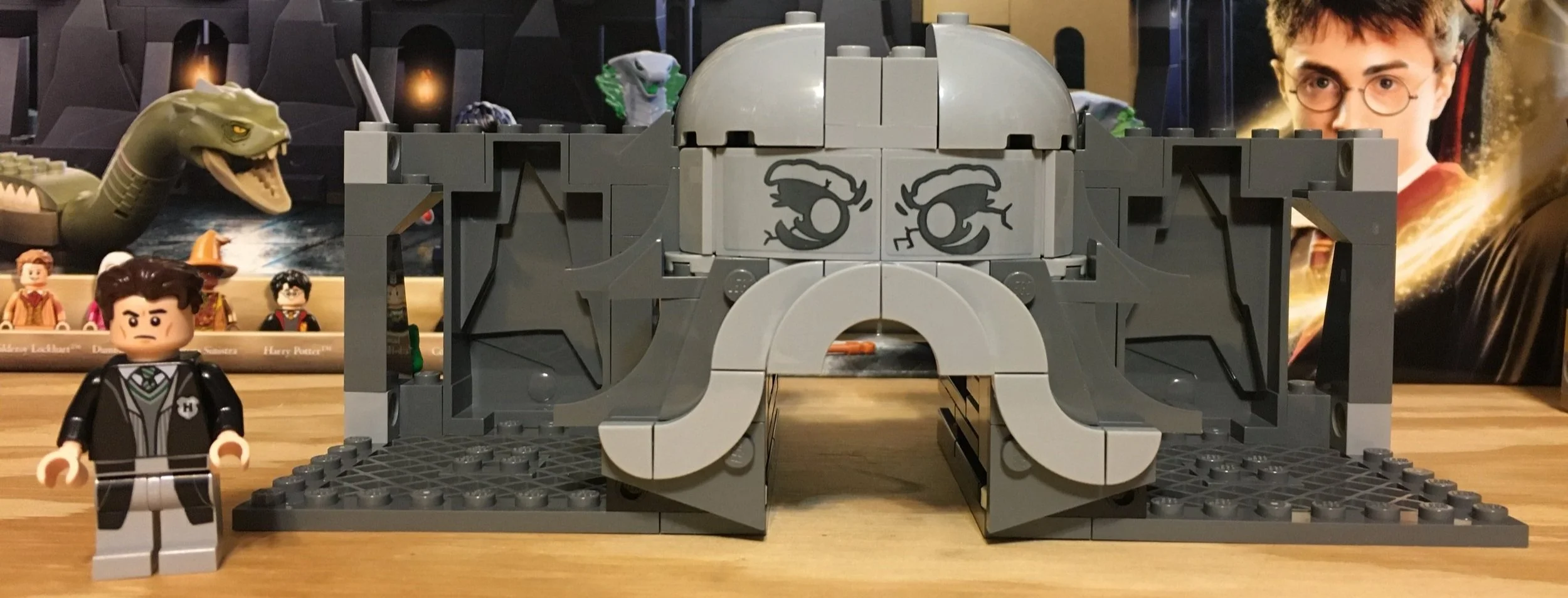 The ninth and final bag finishes up the set. You finish building the chamber and some of the accessories. The mouth of the “stone” face opens up so you can have the basilisk come out. Then there are two small snake heads on stands that can be removed and placed along the… I’m not sure what it’s called… in the movie there’s a long pathway leading up to the place where the basilisk comes out.