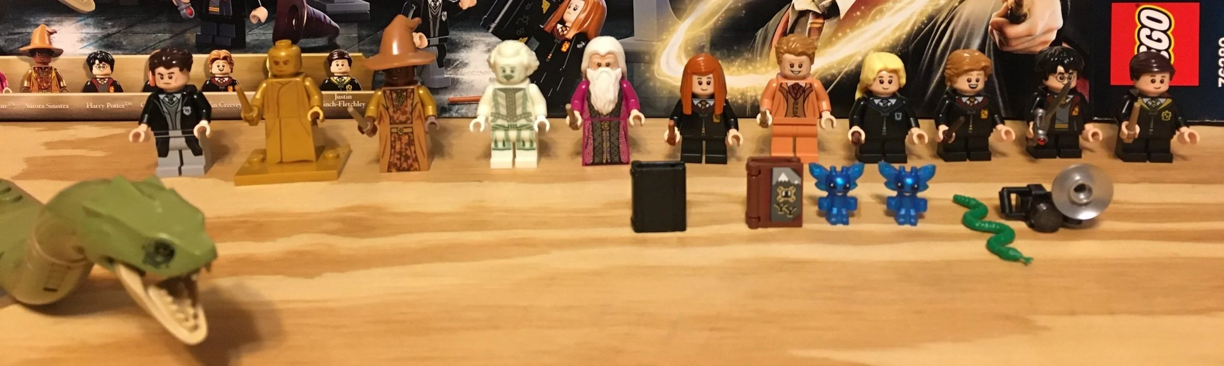 Here are the 11 minifigures, the basilisk, two books, to Pixies, a snake, and a camera.