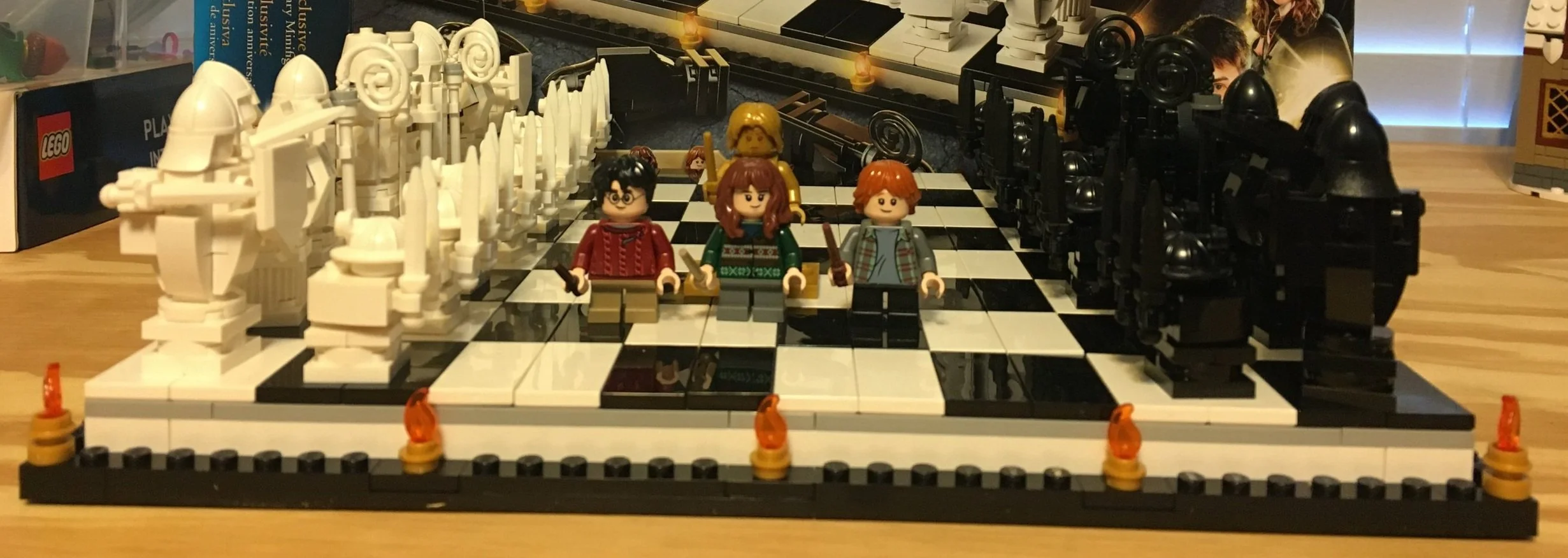 The first set of bags builds the board. I took a picture of one of the earlier steps so you could see the structure underneath. The picture just shows some of the substructure. You add some more pieces in the areas between the long plates so it is pretty sturdy and the board doesn’t bow in. The board gets covered up with alternating pairs of black and white tiles. Along the outside you attach some small pieces to re-create the torches seen in the movie.